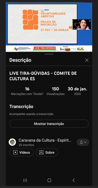 A Live Tira Dúvida , realizada no dia 30 de janeiro de 2024 contou com a participação de diversos agentes culturais de diferentes regiões do Espírito Santo e de outros Estados . A ação durou 03hs.
